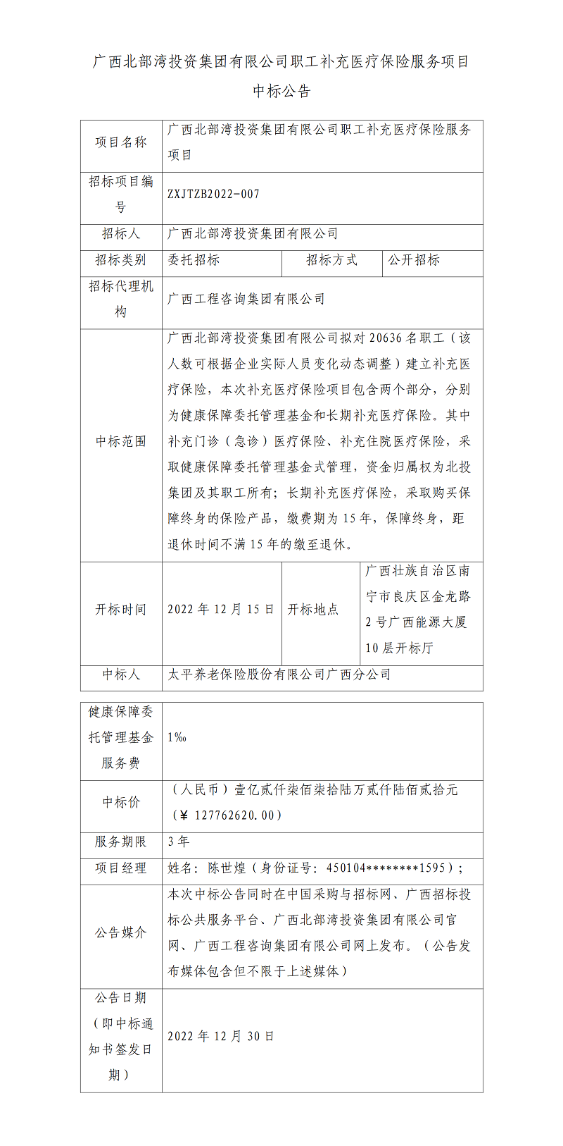 廣西北部灣投資集團有限公司職工補充醫(yī)療保險服務(wù)項目中標(biāo)公告