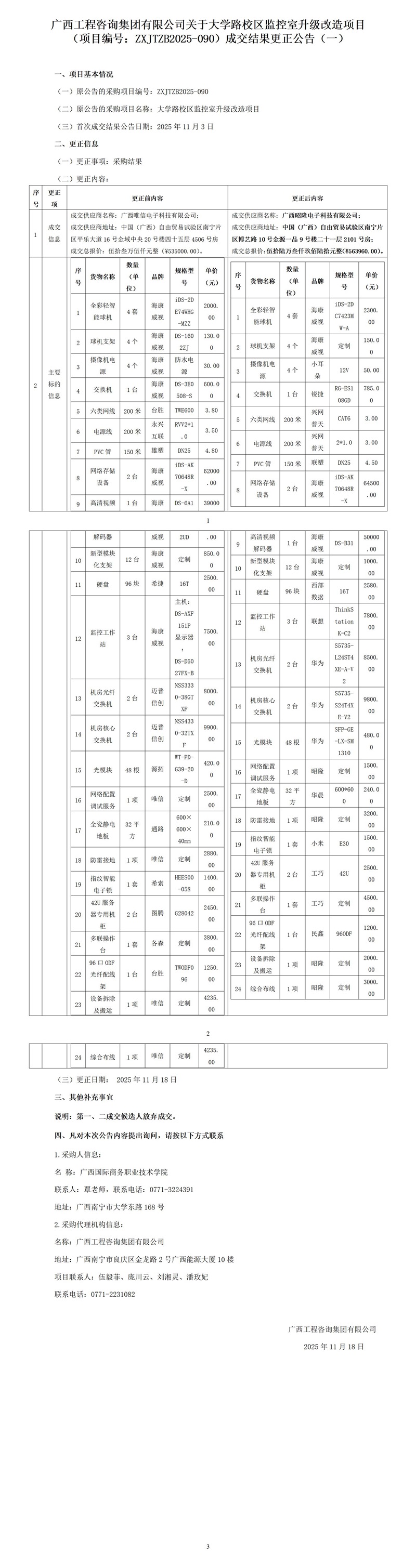 廣西工程咨詢集團有限公司關(guān)于大學(xué)路校區(qū)監(jiān)控室升級改造項目 (項目編號:ZXJTZB2025-090)成交結(jié)果更正公告(一)