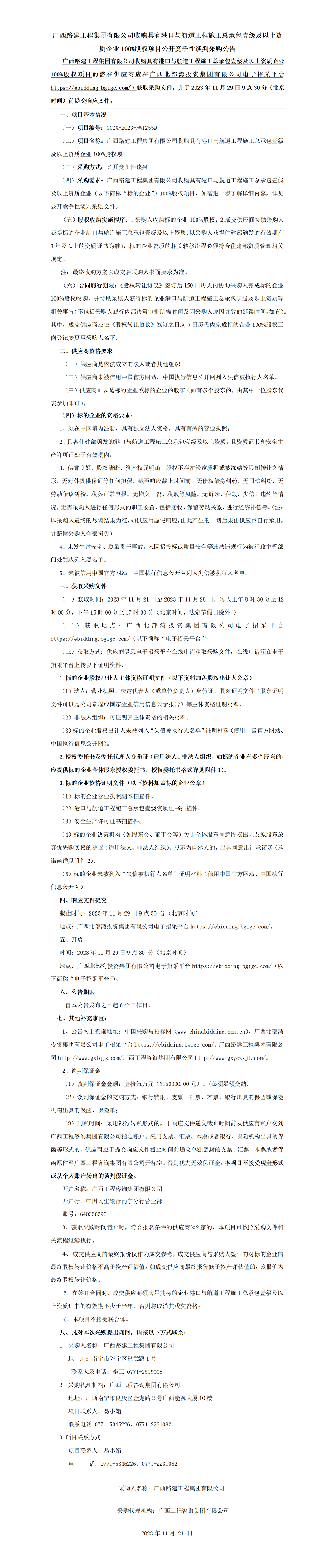 廣西路建工程集團有限公司收購具有港口與航道工程施工總承包壹級及以上資質企業(yè)100%股權項目公開競爭性談判采購公告