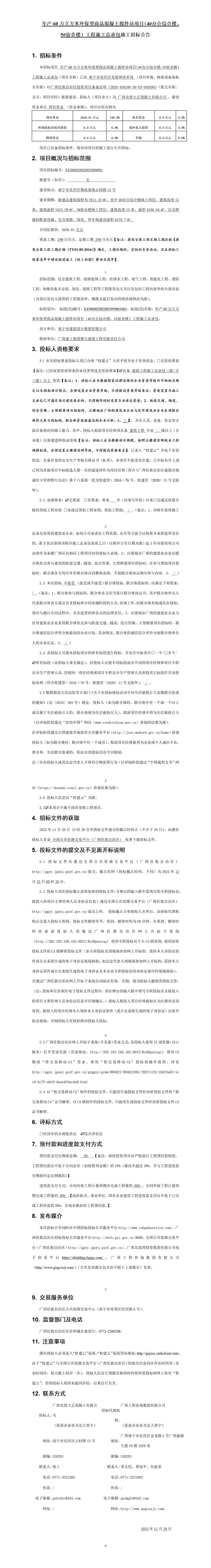 年產(chǎn)60萬立方米環(huán)保型商品混凝土攪拌站項目(4#辦公綜合樓、5#宿舍樓)工程施工總承包施工招標公告